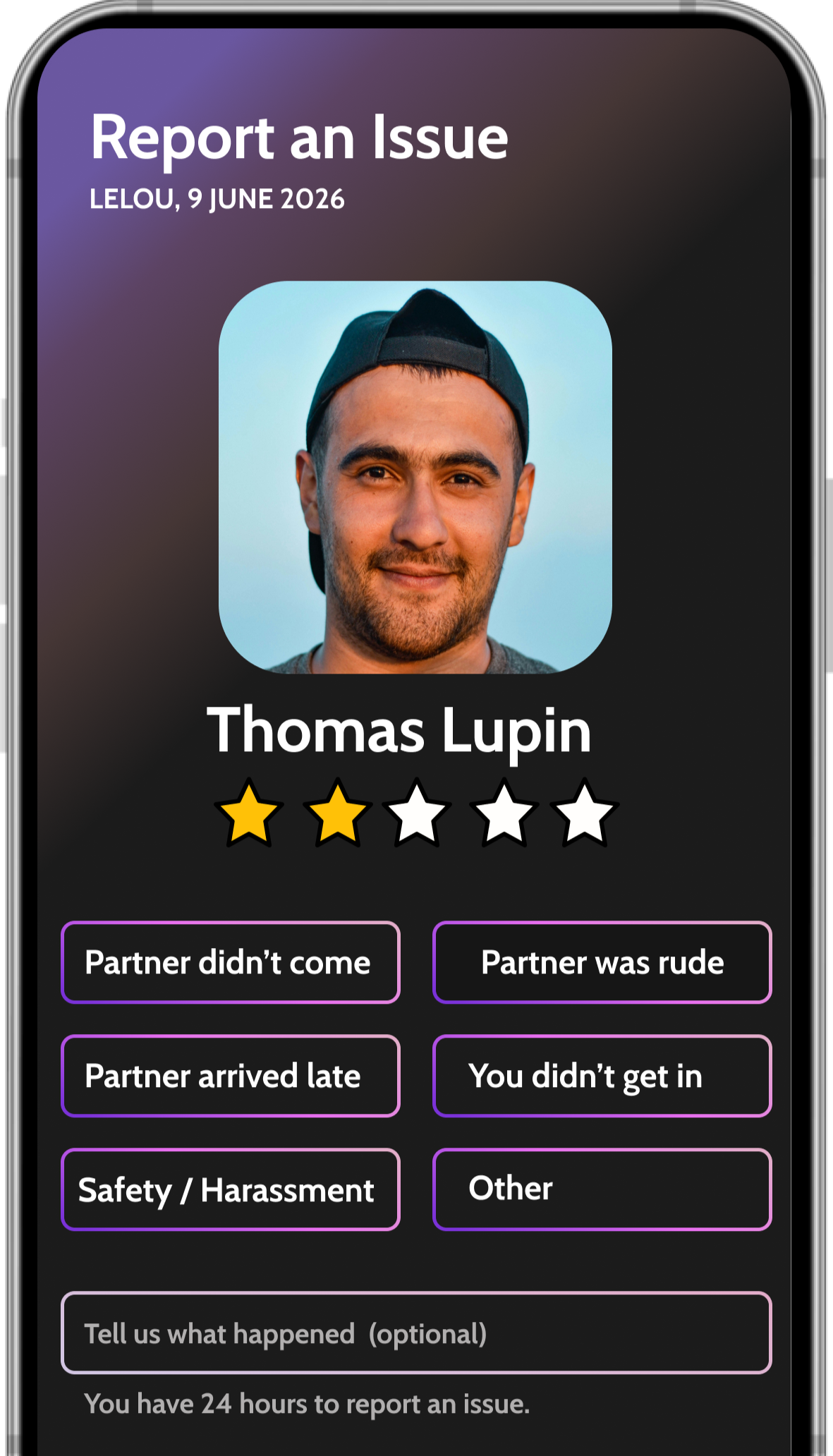 Every connection on PlusIn is built on safety, respect, and clear boundaries. Profiles are verified, and both parties rate each other after every interaction to keep the community authentic and reliable. Harassment, pressure, or any form of misconduct is strictly forbidden. The goal is simple, help each other get in, then enjoy your night your own way.